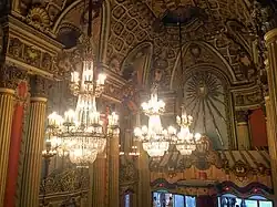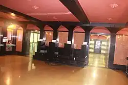 This Los Angeles Theatre was constructed in late 1930 and early 1931. It was commissioned by H.L. Gumbiner, an independent film exhibitor from Chicago,[3] who also built the nearby Tower Theatre.[4] Designed by S. Charles Lee,[5] and Samuel Tilden Norton, the theater features a French Baroque interior. With its grand central staircase and gold brocade drapes, it has for many years been considered to be among the city's most lavish landmarks.[6] The opulent interior is said to have been modeled after the Hall of Mirrors in Versailles.[7] A crystal fountain stands at the top of the grand staircase, a restaurant and a ballroom were on the lower level.[7]