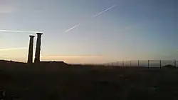 The first thing that is found by the visitor who comes to Los Bañales through the town of Layana are two colossal Tuscan columns. For decades this was mistakenly considered to be a possible access to the forum of the city or part of a market -macellum-, but, in reality, these two columns - and others of which only its base is conserved - formed part of a portico located at the crossroads of two streets. In fact, part of the sidewalks are conserved - in one of whose angles a monumental dwelling was located, which probably belonged to the local elite. This house has a central peristyle to which the main rooms were opened, of which parts of the stone plinth are preserved, on which the different walls would be supported.[63][64] Alongside this area, the remains of a staircase that would lead to another area located on a lower terrace, currently a growing area, are also preserved. All this area was excavated for the last time and very partially, in the 70s of the twentieth century, and partially again in 2017.