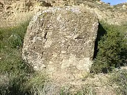 Archaeological examination of the city has calculated that the city of Los Bañales occupied an area of approximately 24 hectares, between the southern slope of the hill of El Pueyo and the mound of El Huso and La Rueca (503m), all the way to the bottom of the valley, where two large round stones in a vertical position were raised in the Roman era and bear (images/inscriptions) of old legends of giants and Sasones, possibly one of the city's boundary markers along the passing road.[28]