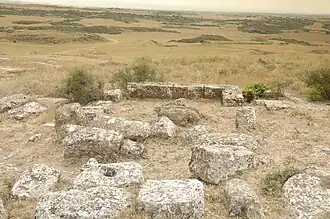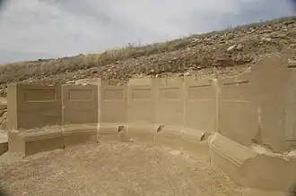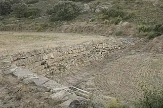 El Pueyo was completely occupied by houses of pre-Roman era, and today you can intuit, observing from a high point, the different blocks of houses -insulae -. In the facades of these houses, which in some cases had to have low commercial -tabernae-, you can see well squared and large blocks located in key areas of the building, while the dividing sockets of the interior were made with hewn stones and perpendicular orthostats to give greater consistency to the wall. Its atypical structure for the Roman model suggests that they are houses adapted to the different periods of survival of the population in this area of the city, from centuries before acculturation with Rome and until centuries after the dismantling of the public structures of the Roman city.[65] Excavated by José Galiay[66] and documented again by Antonio Beltrán,[67] a part of the second mentioned terrace, is currently under study again, since in recent excavations a section of the wall that surrounded this terrace was discovered, with the base of one of its towers and even the doorway of a wall.[68]
