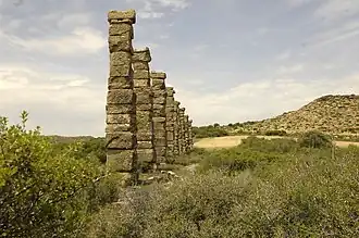 In this elevated part of the aqueduct, 32 of the more than 70 pillars that it was supposed to have are conserved, built with sandstone ashlars from the area, in variable number and thickness in each pillar, depending on the necessary height, placed dry one on another and ingeniously supported on the stratum of sandstones that emerges in the area and in which the foundation boxes needed to balance each pillar on the ground were worked. The upper ashlar of each pillar has a "U" -shaped recess that would serve to support the lintel that would hold the channel -or pipe- that would transport the water and about 90 cm from the crowning of each pillar a horizontal perforation appears from side to side that would allow there to be a system of propping for the support of the lintel in the center of the span between each two pillars.[58]