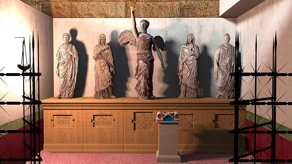 Mausoleum of the Atilii - popularly called the altar of the Moors Its inscriptions indicate that a woman named Atilia Festa built it, in life, for her grandfather Gaius Atilius Genialis, for her father Lucius Atilius Festus and for herself. This facade is one of the ornamental jewels of Roman funerary art in the Iberian Peninsula.[71] In January 2016, Pablo Serrano, infographics artist of the Los Bañales project, carried out a 3D reconstruction of the monument based on detailed photogrammetric documentation and comparison with similar monuments and Roman funerary culture. This reconstruction is hosted on the Los Bañales video channel.[72]