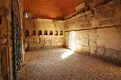 They were excavated by the teams of both José Galiay[53] and later by Antonio Beltrán, who restored it to the state it is in today. It measures about 530 m2 and had a capacity for approximately sixty people. Given the estimated size of the city's population, this is not large enough, and this suggests that they would not be the only baths available. The building was accessed from two small lobbies with benches, which allowed control of the entry and exits, from there to a locker room -apodyterium- in which the niches are preserved as wardrobe -loculi-. Through two doors you can access the cold room -frigidarium- in which there is a small pool -natatio-, or the warm room -tepidarium- and from this to the hot room -caldarium- where there was also a hot water tub, in a room that functioned as a sauna -sudity-. There were latrines accessible from the frigidarium and from the lobby on the east side of the baths.[1]