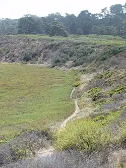 The official name of this trail is simply Marsh Trail.[52] It is unpaved on its west end and paved on its east end. It is shown on Google maps. Dogs and bicycles are prohibited. It skirts the southern edge of the wetland for 1.5 miles from North Torrey Pines Road and becomes Flintkote Avenue in Sorrento Valley, San Diego. The trailhead is across from the South Beach parking lot at Torrey Pines State Beach.