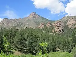 The Lost Creek Scenic Area is a 16,798-acre (67.98 km2)[6][nb 1] site within the Lost Creek Wilderness that was created in 1963 under the 1939 "U-Regulations", which was the precursor of the Wilderness Act. The area was designated a National Natural Landmark in 1966.[7] It is located in the Pike National Forest and is in both Park and Jefferson counties. Rock formations with pinnacles and spires are located in narrow gorges and on ridges. An underground stream "disappears and reappears" nine times or more at the site.[6]