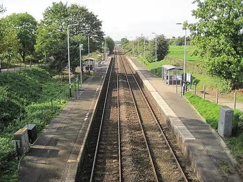 As a result of the Lostock Triangle development, the station is no longer a request stop.[5] In the summer of 2011, new passenger shelters were constructed on both platforms.[6] Prior to this, there had been no protection from the weather for passengers on the Manchester-bound platform.[7] The station is unstaffed, so tickets must be bought on the train or prior to travel. Train running details are offered via digital display screens (fitted in 2015),[8] telephone and timetable posters. Step-free access is available only on the Manchester-bound platform.[9]