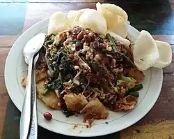 Lotek (alt. spelling: lothek, Javanese: ꦭꦺꦴꦛꦼꦏ꧀) is a Javanese (Indonesian) vegetable-based salad with peanut sauce.[1] While the sauce ingredients are the same with that of pecel, lotek sauce is typically much sweeter to taste, a nod to a classic "Matraman" (adj. belong to the Mataram Sultanate) cuisine.[2][3]