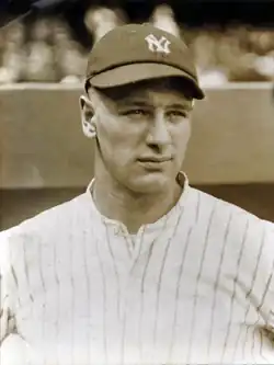 Gehrig joined the New York Yankees midway through the 1923 season and made his major-league debut as a pinch hitter at age 19 on June 15, 1923. In his first two seasons, Gehrig was mired behind Yankee stalwart Wally Pipp at first base, a two-time American League (AL) home run champion and one of the premier power hitters in Major League Baseball's (MLB) "dead-ball era."[28] Gehrig saw limited playing time, mostly as a pinch hitter, playing in only 23 games and being left off the Yankees' 1923 World Series roster in spite of producing both years (with lofty batting averages of .423 in 1923 and .500 in 1924). On June 1, 1925, the slumping Pipp took himself out of the day's lineup with complaints of a headache and was replaced by Gehrig. Pipp would never get his job with the team back, while Gehrig went on to appear in every game the Yankees played until April 30, 1939.[29] In 1925, Gehrig batted .295, with 20 home runs and 68 runs batted in (RBIs) over 126 games.[30]