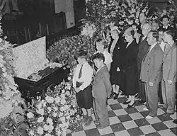 Staff at the Mayo Clinic released their ALS diagnosis to the public on June 19, 1939. Two days later, the Yankees announced Gehrig's retirement, with an immediate public push to honor him.[70] In its coverage the following day, The New York Times wrote that the ceremony was "perhaps as colorful and dramatic a pageant as ever was enacted on a baseball field [as] 61,808 fans thundered a hail and farewell."[71] Dignitaries and members of the Murderers' Row lineup attended the ceremonies and praised Gehrig. New York mayor Fiorello La Guardia called Gehrig the "perfect prototype of the best sportsmanship and citizenship" and Postmaster General James Farley concluded his speech by predicting, "Your name will live long in baseball and wherever the game is played they will point with pride and satisfaction to your record."[70]
