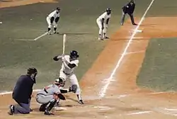 After the 1973 season, Piniella was traded by the Royals with Ken Wright to the New York Yankees for Lindy McDaniel.[25] Baseball author Bill James called the trade the only clinker the Royals made during the 1970s.[26] He played with the Yankees for 11 seasons, during which the Yankees won five AL East titles (1976–78, 1980, and 1981), four AL pennants (1976–78, and 1981), and two World Series championships (1977–78). In 1975, he missed part of the year with an inner ear infection. From mid-1977 through the end of 1980, he split his playing time between left field, right field, and designated hitter.[17]