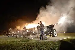 Tchaikovsky's 1880 work 1812 Overture, which is scored for artillery and has passages marked as ffff (in a score, "fortississimo" (fff) instructs the musicians to play the marked passage extremely loudly and is normally the loudest volume specified; "fortissississimo" (ffff), which means to play louder than fortississimo, is sometimes used) has been described as the loudest classical piece.[4][5] The piece has been played with FH70 155 mm (6.1 in) howitzers and Type 74 Main Battle Tanks included in the orchestra instrumentation[6] (a typical 155mm howitzer generates about 180 dB at the source,[7][8] sufficient to sometimes cause immediate and permanent hearing damage (artillery crews are issued hearing protection)).[9] The piece is usually performed outdoors or with simulated or recorded cannons, but an indoor performance with live cannon at the Royal Albert Hall has been cited as having been particularly loud.[10]