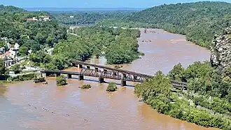 The Appalachian Trail (AT) traverses the peak before descending its northwestern slope to the Shenandoah River and Harpers Ferry. A spur trail called the Loudoun Heights Trail (the original route of the AT) leads off the AT down the northern slope, passing by Civil War earthworks and providing good views of the confluence of the Potomac and Shenandoah as well as Harpers Ferry at the Split Rock overlook.[3] The trail until recently descended from the overlook before crossing the Potomac on the U.S. Route 340 bridge and rejoining the AT at Sandy Hook, Maryland. However, this section was closed due to erosion and damage following storms.