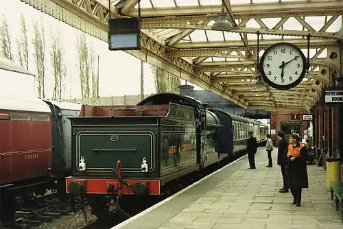 Reopened by the Great Central Railway as part of the restored heritage railway in 1974, train services currently run south from the station to Leicester North. Within the station complex, the station buildings, original GCR signal box sited to the north, and the three original water tanks are all Grade II listed.[2]