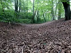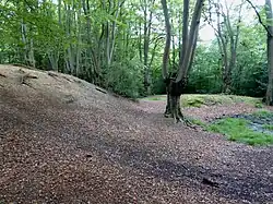 The southwestern edge of the camp falls away sharply to an area known as Kate's Cellar (a hermit who reputedly once lived in this area of the forest). An early 19th Century map shows Dick Turpin's hideout here (there are a number of locations within Epping Forest's 6,000 acres (24 km2) which claim the same).