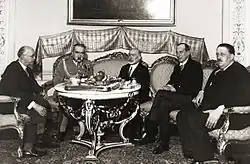 As Foreign Minister, Barthou met King Alexander I of Yugoslavia during his state visit to Marseille in October 1934. On 9 October, King Alexander was assassinated by Vlado Chernozemski, a Bulgarian assassin wielding a handgun.[7] Another bullet struck Barthou in the arm, passing through and fatally severing an artery. He died of blood loss less than an hour later. The assassination had been planned in Rome by Ante Pavelić, head of the Croatian Ustaše, in August 1934. Pavelić was assisted by Georg Percevic, a former Austro-Hungarian Armed Forces officer. France unsuccessfully requested the extradition of Percevic and Pavelić.[8] This assassination ended the careers of the Bouches-du-Rhone prefect, Pierre Jouhannaud, and of the director of the Surete Nationale, Jean Berthoin.[9]