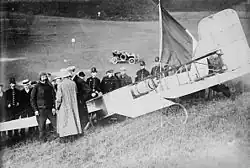This was shortly followed by the Blériot XII, a high-wing two-seater monoplane first flown on 21 May, and for a while Blériot concentrated on flying this machine, flying it with a passenger on 2 July, and on 12 July making the world's first flight with two passengers, one of whom was Santos Dumont.[25] A few days later the crankshaft of the E.N.V. engine broke, and Blériot resumed trials of the Type XI. On 25 June he made a flight lasting 15 minutes and 30 seconds, his longest to date, and the following day increased this personal record to over 36 minutes. At the end of July he took part in an aviation meet at Douai, where he made a flight lasting over 47 minutes in the Type XII on 3 July: the following day he flew the Type XI for 50 minutes at another meet at Port-Aviation (often called "Juvisy Airfield") at Viry-Châtillon, and on 13 July he made a cross-country flight of 41 km (25 mi) from Etampes to Orléans. Blériot's determination is shown by the fact that during the flight at Douai made on 2 July part of the asbestos insulation worked loose from the exhaust pipe after 15 minutes in the air. After half an hour, one of his shoes had been burnt through and he was in considerable pain, but nevertheless continued his flight until engine failure ended the flight. Blériot suffered third-degree burns, and his injuries took over two months to heal.[26]