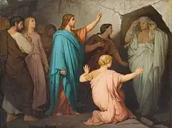 George Landow saw in Croyantes "a moving image of pagans at prayer before an idol," wherein Leroux "simultaneously dignified pagan belief and removed the privileged position Christianity presumably held in the mind of the spectator."[30] About the same painting, Théophile Gautier asked, "Will the miracle happen?" and answered in the affirmative: "Hygieia will not let this charming patient so full of faith die, and will save her for the honor of polytheism."[31]