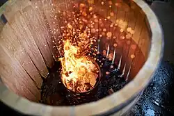 As an historical activity, Maison Louis Latour's own onsite cooperage produces approximately 3,500 oak barrels a year; half of which are used to mature their own wines, while the other half are exported worldwide for use in other wineries for Pinot Noir and Chardonnay. The oak is sourced from the forests of Northern and Central France, where it is aged in the open air for more than two years. The master coopers shape the wood by hand, using traditional techniques. The barrels are medium toasted and branded with the year of production, which allows the in-house oenologists to choose a proportion of new or already used barrels for each wine, and to form a clear idea of the exchange that will occur between the wood and the wine.[7]
