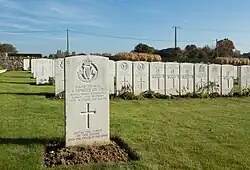 Although Lipsett was unhappy about the transfer, he acquiesced and took energetic command of the division during the Hundred Days Offensive. On 14 October 1918, whilst planning an assault at Saulzoir in France he was crawling along a bank overlooking the River Selle with several officers of his own staff and some of the 49th (West Riding) Division, when at about 3:15 in the afternoon the party was spotted and a German machine gun opened fire from across the river. The party went to ground but a single bullet struck Lipsett in the face. He was able to stagger back to his own lines but there collapsed from massive blood loss and never regained consciousness.[18] He was the last British general to be killed in frontline action during the First World War. Lipsett was buried the following day in Quéant Communal Cemetery[19] with his funeral attended by dozens of officers from the British and Canadian armies in France including Byng and Lipsett's close friend and corps commander, Currie. The burial party was provided by the unit he had entered the war in command of, the 8th Battalion, C.E.F., and amongst the mourners was the Edward, the Prince of Wales.[20] After the war he was posthumously awarded the Croix d'officier de la Legion d'honneur and the Croix de Guerre by the French government.[21][3] The Imperial War Graves Commission headstone erected over Lipsett's grave bears the inscription: OUT OF THE STRESS OF THE DOING / INTO THE PEACE OF THE DONE.[19]