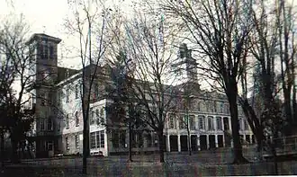 The almshouse, located in Cumru Township, Shillington, was originally the property of Governor Thomas Mifflin and was known as Angelica Farm. The first building, a home for the insane, was constructed in 1824. Separate houses for male and female inmates were established in 1832. A modern hospital was added in 1874, devoted to caring for the infirm, sick, disabled, and feeble-minded as well as the insane. A report, prepared in 1885, found that the insane were not receiving adequate care and should be transferred to a state hospital. By the early 20th century, their focus had shifted almost entirely to caring for the infirm and elderly. The outdated complex was demolished in 1957 and part of the land was taken by the local school district.[1]