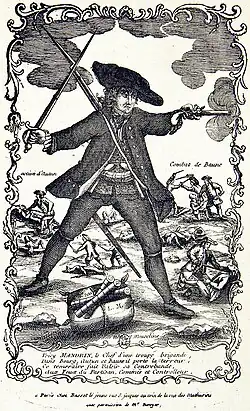 Mandrin's struggle against the injustice of the Ancien Régime was discussed across Europe and the cause taken up by Voltaire (who compared him with the king of Prussia)[3][4] and Turgot. Mandrin's status as a rebel folk hero was cemented. A popular ballad arose, the Complainte de Mandrin, that was sung throughout France and is still known today. Its author remains unknown.