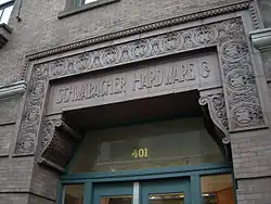 While Schwabacher's Wharf survived the Great Seattle Fire, their retail store did not. Within 16 days, they had erected temporary one-story brick building at Front Street (now First Avenue) and Madison Street. In 1893, another fire burned out their hardware department, prompting new construction with the hardware department as the separate Schwabacher Hardware Company,[4] headed by Sigmund Schwabacher, who for the rest of his life traveled frequently between San Francisco and Seattle.[17] Upon Sigmund's death in 1900, he was succeeded at Schwabacher Hardware by his son Leopold (Leo) S. Schwabacher (December 26, 1871 – April 6, 1930). Three years later, Leo married Edna Blum of San Francisco; they settled in Seattle.[1][18] Another fire hit the Schwabacher Hardware Company on February 11, 1905, leading to the construction of a new and even larger store at First Avenue South and South Jackson Street.[4]