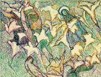 During the early part of his stay there, he made sketches with pen and pencil in small school notebooks and practiced music in the chapel; sometimes giving lessons. His cousin, Le Corbusier, who had discovered him there in 1927, was impressed with what he saw and helped him acquire better materials for his artwork. By 1937, his hands were crippled with osteoarthritis and he began to use his fingers; dipping them directly into the ink or paint. Meanwhile, Le Corbusier was gathering his works. Through his efforts, exhibitions were held in Hartford (1936), Lausanne (1937) and New York (1939). Soutter's new-found approach, applying ink directly to paper with his fingers, eventually led Le Corbusier to shun the artist, being 'the antithesis to Le Corbusier's architectural emphasis on order.'[8]