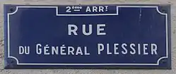 Plessier is sometimes considered the first French general to be killed during the war; four other generals pre-deceased him (Raffenel, Rondony, Diou and Deffontaines), but Plessier received his mortal wound first.[11] Plessier was posthumously appointed a commander of the Legion of Honour on 16 May 1915, backdated to 21 August 1914.[1] His death, and that of the 600 men of his brigade who died on 19 August, is commemorated by a memorial obelisk in Mulhouse.[11] A street in the 2nd arrondissement of Lyon is named in his honour.