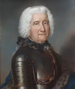 Louis served in the French Army during the War of the League of Augsburg (also known as the Nine Years' War), participating in the Siege of Philippsburg in 1688, the Battle of Fleurus in 1690, and Battle of Steenkerque in 1692.[7] After his military service, Grimberghen entered the service of Charles VII, the Holy Roman Emperor who was also King of Bohemia and Elector of Bavaria, who made Louis a Count. He served as Charles VII's (until 1742, Charles-Albert was not emperor and not recognised as Charles VII) diplomatic envoy from the Electorate of Bavaria to France From 1733 to 1736 and again from 1741 to 1742 and 1745 to 1747.[8] The title Prince of Grimberghen, which had been held by his late brother-in-law who passed away without issue in 1721, was bestowed upon him by the Emperor in 1742.[7][9]