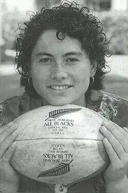 Wall also made the New Zealand women's national rugby union team, the Black Ferns, in 1995, as a wing. This team would go on to win the first ever fully-sanctioned Women's Rugby World Cup in 1998.[12] The team won their first game against Germany 134–6, and the final against the USA 44–12.[18] Wall never reportedly never lost a game while playing with the Black Ferns.[19] In 1997, Wall won the title of New Zealand Women's Rugby Player of the Year.[20] She retired in 2002, aged 30, after suffering several knee injuries.[8][21]