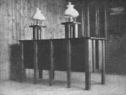 Highly influential for Brigham's later design work were two summers spent in a coal-mining camp on the Norwegian island of Spitsbergen, which sits well above the Arctic Circle in the Svalbard archipelago.[3] Brigham does not precisely date these two summers in her published writings, but a reference to a visit by members of an expedition led by the American aviator Walter Wellman suggests that one of them was 1906, the year that Wellman set up headquarters in the Svalbard archipelago in an attempt to reach the North Pole by airship. Brigham stayed in a camp managed by John Munro Longyear, a fellow Bostonian of her father’s generation. In 1905, Longyear had co-founded the Arctic Coal Company to carry out mining operations in an area along the west coast of Spitsbergen that came to be called Longyear City (today Longyearbyen). The camp housed 80 men at the time Brigham was there—rising to several hundred in the years leading up to World War I—and conditions were extremely primitive. Enough food and equipment had to be brought in by ship during the summer months to supply the camp during the eight months it would be cut off from the outside world by winter ice, and the result of this stockpiling was large stacks of empty boxes. Under these difficult conditions, Brigham undertook to design what she called "box furniture" for the camp out of those cast-off packing crates, following up on some earlier experiments along the same lines.