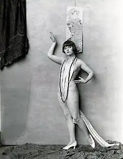 Brooks traveled to Europe accompanied by Marshall and his English valet.[36] The German film industry was Hollywood's only major rival at the time, and the film industry based in Berlin was known as the Filmwelt ("film world"), reflecting its self-image as a highly glamorous "exclusive club".[62] After their arrival in Weimar Germany, she starred in the 1929 silent film Pandora's Box, directed by Pabst in his New Objectivity period.[63] Pabst was one of the leading directors of the filmwelt, known for his refined, elegant films that represented the filmwelt "at the height of its creative powers".[64] The film Pandora's Box is based on two plays by Frank Wedekind (Erdgeist and Die Büchse der Pandora),[65] and Brooks plays the central figure, Lulu.[65] This film is notable for its frank treatment of modern sexual mores, including one of the first overt on-screen portrayals of a lesbian.[66]