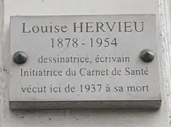 The rue Louise Hervieu, a street in the 12th arrondissement of Paris, pays homage to her. A commemorative plaque is placed on rue du Cherche Midi in the 6th arrondissement of Paris, at number 55, where she lived.