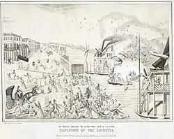 The Louisiana was a Mississippi River steamboat that exploded on November 15, 1849, killing at least 150 and possibly as many as 200 people, and grievously wounding scores of others.[1][2] All of the boilers exploded simultaneously about five minutes after she pulled away from the dock at Gravier Street in New Orleans; the entire boat sank 10 minutes after the explosion.[2] Several of the dead were on the steamer Storm, which was docked adjacent to the Louisiana.[2]