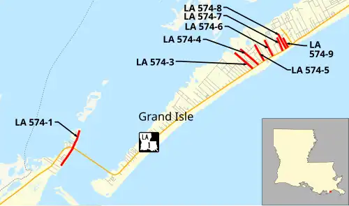 Louisiana Highway 574 (LA 574) is a collection of eight current and four former state-maintained streets in Grand Isle, located in lower Jefferson Parish. All twelve routes were established with the 1955 Louisiana Highway renumbering.