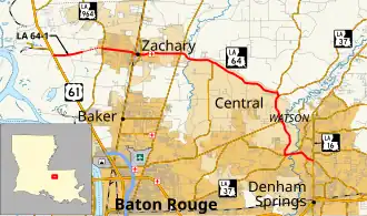 Louisiana Highway 64 (LA 64) is a state highway located in southeastern Louisiana. It runs 20.45 miles (32.91 km) in a general east–west direction from LA 964 in Zachary to the junction of LA 16 and LA 1026 north of Denham Springs.