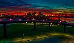 Louisville Waterfront Park is both a non-profit organization and an 85-acre (340,000 m2)[1] public park adjacent to the downtown area of Louisville, Kentucky and the Ohio River. Specifically, it is adjacent to Louisville's wharf and Riverfront Plaza/Belvedere, which are situated to the west of the park. Once a wasteland of scrap yards and abandoned industrial buildings, Waterfront Park is now a vibrant green space that welcomes over 2.2 million visitors each year. Located in the park is the Big Four Bridge which connects the city of Louisville with the City of Jeffersonville, Indiana. Waterfront Park is home to some of Louisville's most exciting celebrations, such as the Fourth of July at Waterfront Park, Forecastle Festival, WFPK Waterfront Wednesdays and Thunder Over Louisville.[1] In 2013 the park won the Rudy Bruner Award for Urban Excellence a national design award that seeks to identify and honor places that address economic and social concerns in urban design.[2]