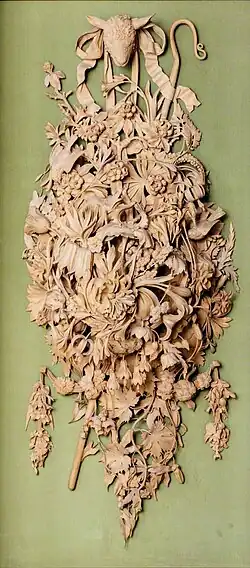 Wallis specialised in carving realistic wooden trophies of dead birds, in particular game birds, as well as intricately carving fruit, flowers and foliage in limewood from a clay model. His method was to first make a model of the proposed carving in pipe-clay on a wire frame before making the carving from a single block of limewood. Wallis sold his first piece of 'fancy carving' in 1846 for £2 to a Mr Tuke of York. He also drew architectural views which he reproduced as lithographs.[5] He went on to create about seventy carvings of outstanding quality, usually of dead birds and foliage, from a single piece of limewood, mainly to commission. In 1850 Wallis received a silver medal for his wood carving from the Royal Society of Arts, and was awarded a Prize medal for his exhibits of wood carving at the Great Exhibition of 1851. Here his carvings included 'Trophy of Spring', a group of three dead game birds: a partridge, woodcock and snipe which took eight months to carve, in addition to a golden plover with an ivy branch, and two carvings of flowers and fruit. He was awarded further medals at the Paris Exhibition of 1855 and the 1862 International Exhibition. The renowned artist and critic John Ruskin favourably compared the work of Wallis to that of Grinling Gibbons.[5]