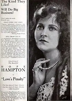 Love's Penalty is a 1921 American drama film written and directed by John Gilbert. The film stars Hope Hampton, Irma Harrison, Mrs. Phillip Landau, Percy Marmont, John B. O'Brien, and Virginia Valli. The film was released in June 1921, by Associated First National Pictures.[1][2][3]
