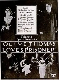 Love's Prisoner is a 1919 American silent crime drama film starring Olive Thomas. Written by E. Magnus Ingleton, the film was directed by John Francis Dillion.[1]