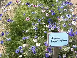 This easily grown plant has been a familiar subject in English cottage gardens since Elizabethan times, admired for its ferny foliage, spiky flowers and bulbous seed-heads. It is now widely cultivated throughout the temperate world, and numerous cultivars have been developed for garden use. 'Persian Jewels' is a mixture of white, pink, lavender and blue flowers. 'Persian Rose' is pale pink. Other cultivars are 'Albion', 'Blue Midget', 'Cambridge Blue', 'Mulberry Rose', and 'Oxford Blue'. 'Dwarf Moody Blue' is around 15 cm (6 in) high. The pale blue ‘Miss Jekyll’[6] and the double white-flowered 'Miss Jekyll Alba' have gained the Royal Horticultural Society's Award of Garden Merit.[7][8]