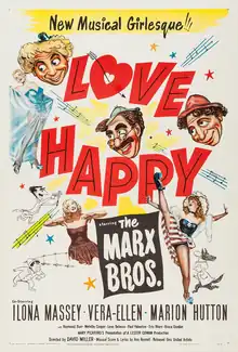 Love Happy is a 1949 American musical comedy film released by United Artists, directed by David Miller and starring the Marx Brothers (Groucho, Harpo and Chico) in their 13th and final feature film. The screenplay was written by Frank Tashlin and Mac Benoff, based on a story by Harpo.