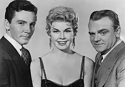 Primarily recognized as a musical-comedy actress, Day began to accept more dramatic roles in order to broaden her range. Her dramatic star turn as singer Ruth Etting in Love Me or Leave Me (1955), with top billing above James Cagney, received critical and commercial success, becoming Day's greatest film success to that point.[48] Cagney said that she had "the ability to project the simple, direct statement of a simple, direct idea without cluttering it," comparing her performance to that of Laurette Taylor in the Broadway production The Glass Menagerie (1945).[49] Day felt that it was her best film performance. The film's producer Joe Pasternak said, "I was stunned that Doris did not get an Oscar nomination."[50] The film's soundtrack album became a No. 1 hit.[51][52]