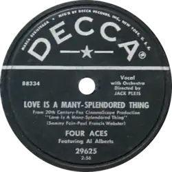 The song was covered by The Four Aces featuring Al Roberts backed by the Jack Pleis Orchestra and issued by Decca Records as catalog number 29625. The film studio 20th Century Fox was said to have subsidized an album of The Four Aces so that they may release it as a single to help promote the film.[7] The song was released backed with "Shine On, Harvest Moon" in July 1955,[10] and first reached No. 1 on the Best Sellers chart in October 1955.[11] It also became the first number one on Billboard's new Top 100 chart, released in November 1955.[12][13] It was ranked No. 8 on Billboard's 1955's Top Tune year-end chart.[14]