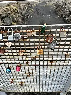 The oceanic divergent plate boundary of North American Plate and Eurasian Plate divides Iceland. The western part of Iceland sits on the North American Plate and the eastern part sits on the Eurasian Plate. The Reykjanes Ridge of the Mid-Atlantic ridge system in this region crosses the island from southwest and connects to the Kolbeinsey Ridge in the northeast. There are love locks on the footbridge at the rift.[12]: 39, 40, 49