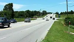 U.S. Route 71B passes through the center of Lowell as Bloomington Street and leads north 5 miles (8 km) to the center of Rogers and south 5 miles to the center of Springdale. Interstate 49 and U.S. Route 71 pass to the west of downtown Lowell, with access to the city at Exit 78 (Arkansas Highway 264). I-49 leads north 14 miles (23 km) to its end north of Bentonville and south 14 miles (23 km) to Fayetteville and 69 miles (111 km) to Fort Smith. Highway 264 is a main east-west road in Lowell, connecting I-49 and US 71B.