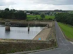 The reservoir has an embankment as the dam head which is straight and extends to a length of 1,010 feet (310 m), a height of 84.5 feet (25.8 m) and which also supports a road between Oxenhope and Stanbury village. The road (since known as Waterhead Lane) used to cut across Sladen valley taking a north west route from Intake Farm and going through the small hamlet of Smith Bank.[9] The hamlet and its mill (which featured in Halliwell Sutcliffe's novel A Man of the Moors[10]) were flooded when the reservoir was completed with the road being diverted northwards onto the dam head.[11] The dam head is concrete with a clay puddle core. There is a spillway at the northern end which drops down to the adjoining waterworks facility.[12]