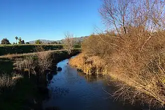 The creek currently drains an area of over 43 square miles (110 km2) with its source in the Edenvalle Hills of southeast San Jose, California.[6] Upper Silver Creek and Thompson Creek both begin in the Edenvale Hills, and historically sank into the alluvial basin of Evergreen Valley in southeast San Jose. Then they resurfaced and flowed into a large freshwater marsh known historically as Laguna Socayre, and referred to more recently as Silver Creek Marsh.[7] In 1978, Silver Creek Marsh was excavated into a flood water detention pond or reservoir, now known as Lake Cunningham.[6] Thus, Lower Silver Creek used to begin southwest of where Lake Cunningham is today, but now its source is regarded as just north of this artificial lake by the Santa Clara Valley Water District (now Valley Water) at the confluence of Thompson Creek and Flint Creek. In the 1970s, Upper Silver Creek flows were shunted due west into a flood control channel discharging directly to Coyote Creek south of Singleton Road.[8]