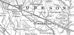 In 1835 the Constitution of North Carolina classified the eastern Carolina Native Americans as "free persons of color".[6] While having previously enjoyed the same political rights as white people, the Lumbees were disenfranchised by the new constitution.[7] In 1840 the North Carolina General Assembly passed a law prohibiting free nonwhites from bearing arms without a license from the Court of Pleas and Quarter Sessions in their county. In 1853 the North Carolina Supreme Court affirmed the legality of the law in its ruling for State v. Noel Locklear, involving the case of a man convicted of unlawful possession of a firearm.[8] White farmers in Robeson County also sought ways to obtain Lumbees' land or labor. According to Lumbee oral tradition, the "tied mule" incidents were emblematic of this. In these scenarios, a farmer would tie his mule on a Lumbee's land and release some of his cattle there, before bringing local authorities to the scene to accuse the Lumbee landowner of theft. Doubtful of a fair trial in the courts, a Lumbee would settle with the farmer by either offering him a portion of land or free labor.[9] The legal discrimination and exploitative practices heightened racial tensions in the area.[10][11]