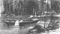 Meanwhile, the combined Alfordsville and Thompson's Township detachments under Captain Charles McRae captured Flora Strong (Andrew's wife) and handed her over to other militiamen to be taken to Buie's Store. That evening, McRae's men stopped to rest at Wire Grass Landing on the banks of the Lumber River.[136] While they were there, Henry Berry Lowry paddled by in a canoe. The militiamen recognized him and opened fire. Lowry jumped into the river and retrieved his rifle from the boat. Using it as a shield, he swam towards the landing while resting his gun over top of the craft, firing as he approached. He wounded two men before McRae ordered the militia to retreat.[137]